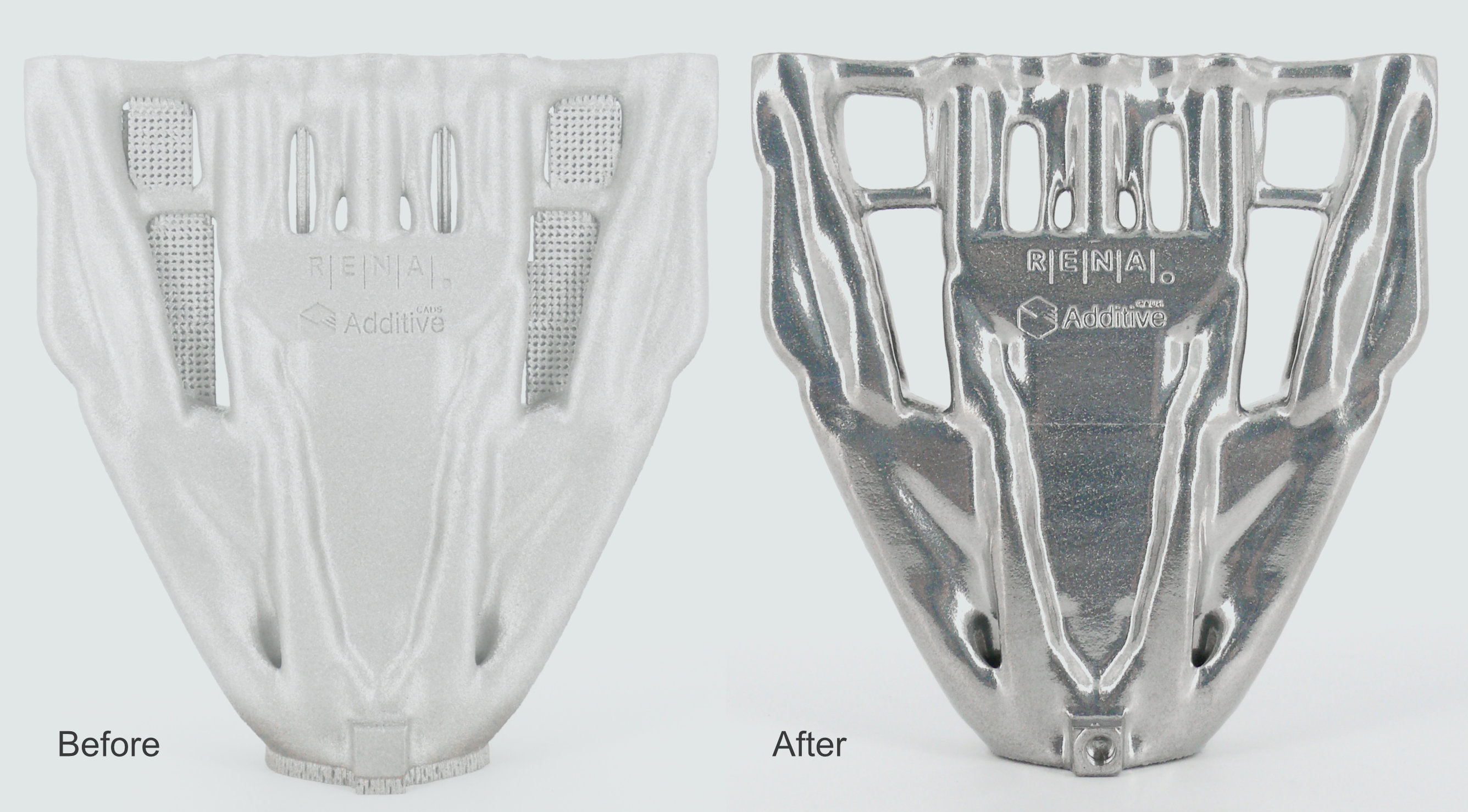 2) The Hirtisation® process effectively removes support additive manufacturing structures and powder cake but goes further by reducing the surface roughness