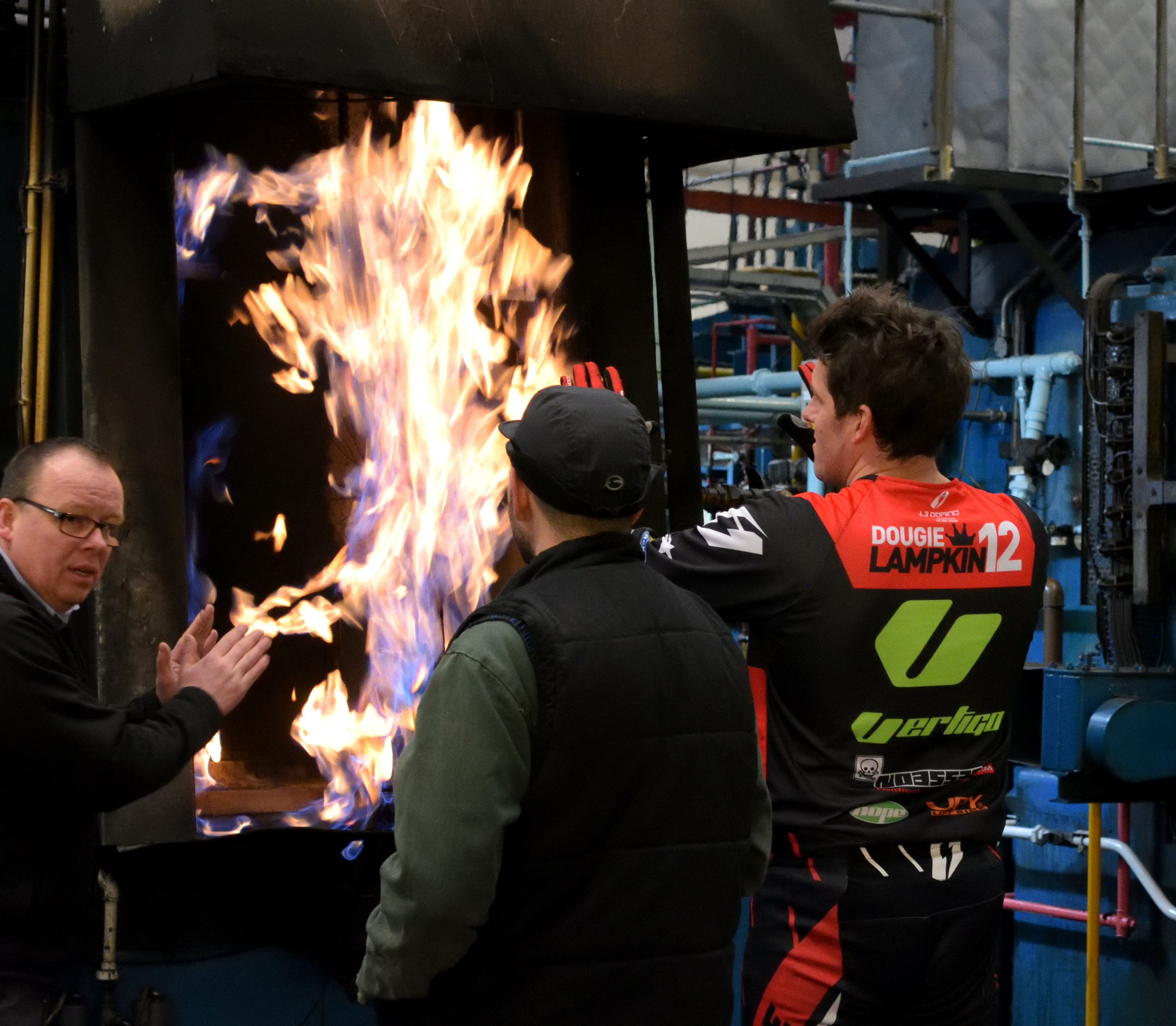 6) Dougie Lampkin warming up by the heat of a furnace before the hard work begins