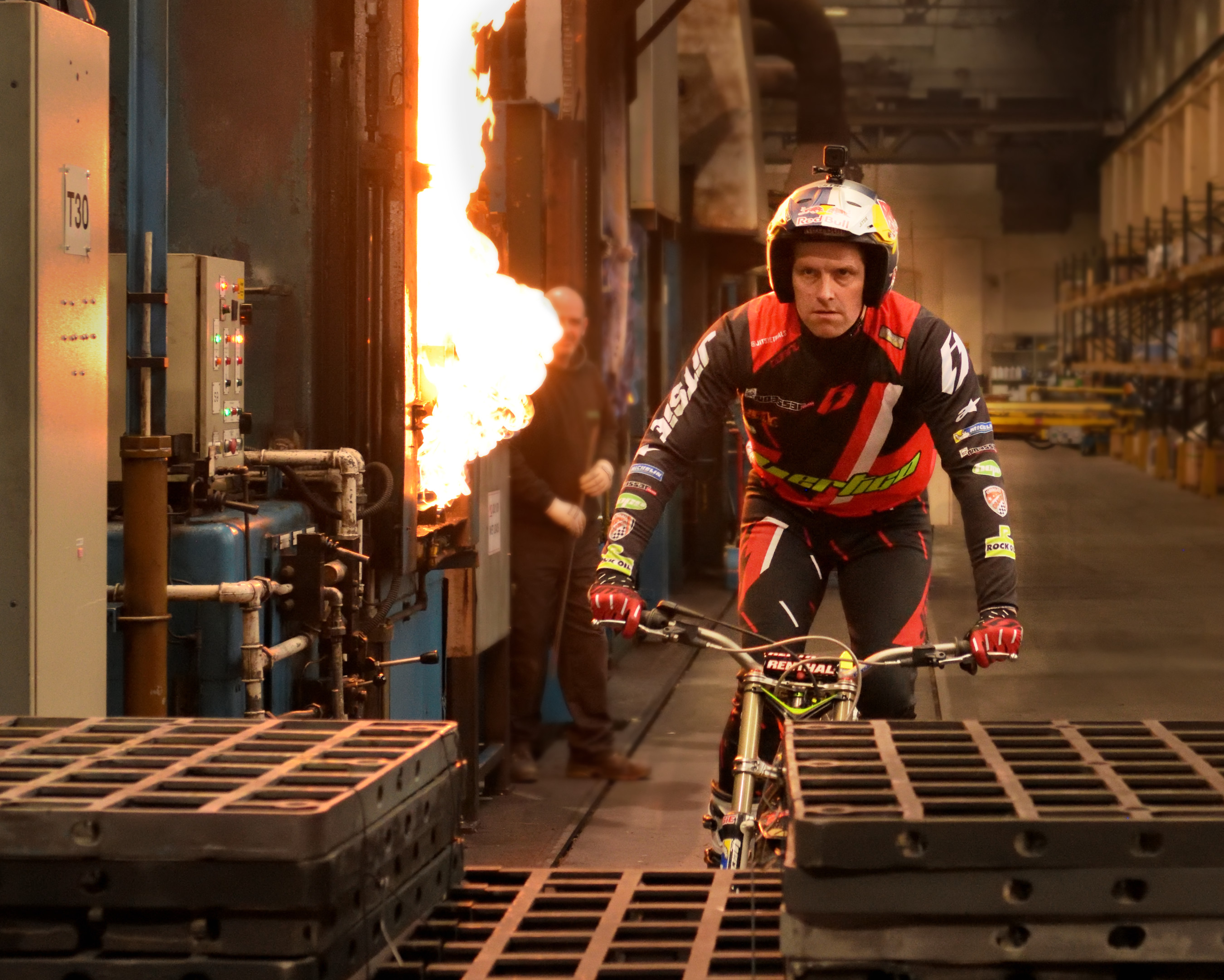 1a) 12 times Trials World Champion, Dougie Lampkin, rides past flaming furnaces at Wallwork Heat Treatment
