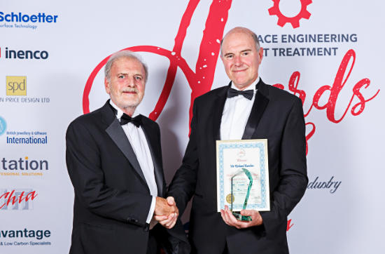 1) Richard Burslem (right) receiving the award from Alin Hick. (Image courtesy of Bandele Zuberi - high resolution images available to purchase http://clients.bandelezuberi.com/gallery/sea-awards-2018/)